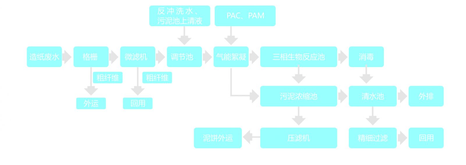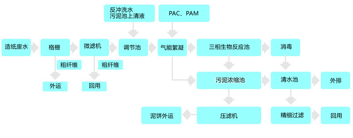 廢水通過格柵去除浮渣,經(jīng)由微濾機回收紙漿后進入氣能絮凝系統(tǒng),通過投加混凝劑,再經(jīng)其凝聚、氣浮、撇渣、沉淀、刮泥處理后可去除污水中85% 以上的SS, 50%以上的非溶解性COD及部分溶解性COD和BOD。其出水進入完全混合式曝氣池,通過向池內(nèi)補充投加N、P等營養(yǎng)物質(zhì),并利用吸附再生池增強回流污泥的微生物活性等方式高效降解污水中的有機物質(zhì)。出水經(jīng)由二沉池進行固液分離,上清液消毒達標后外排或精細過濾后回用。