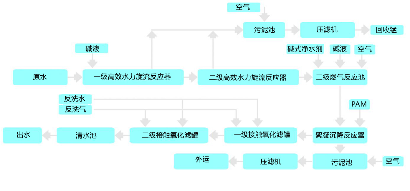 原水進入兩級高效水力旋流反應器,在進水管道前投加藥劑調節PH值,在反應器內形成初級懸浮態水合錳氧化物,并在錐形分離區初步實現固液分離,上清液進一步調節pH,充分曝氣后,水中殘余的錳離子轉化成水合MnO2及Mn(OH)2,在絮凝沉降反應系統內再次固液分離。出水經二級“活性濾膜”自催化系統精細過濾,達到設計標準(錳≤2mg/L、鐵≤1mg/L)。