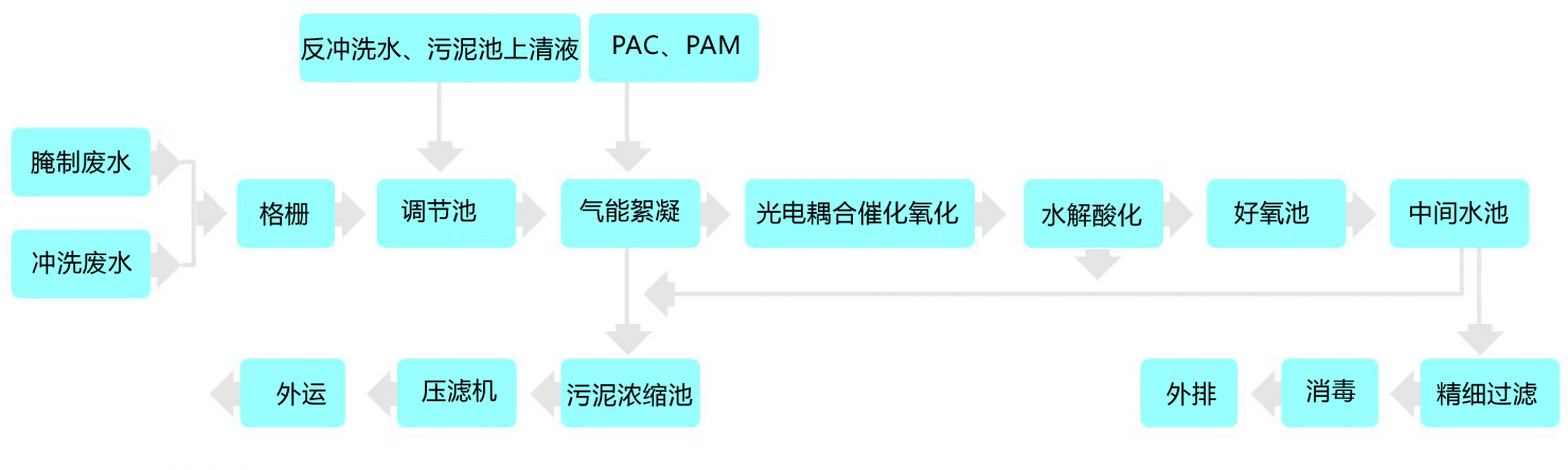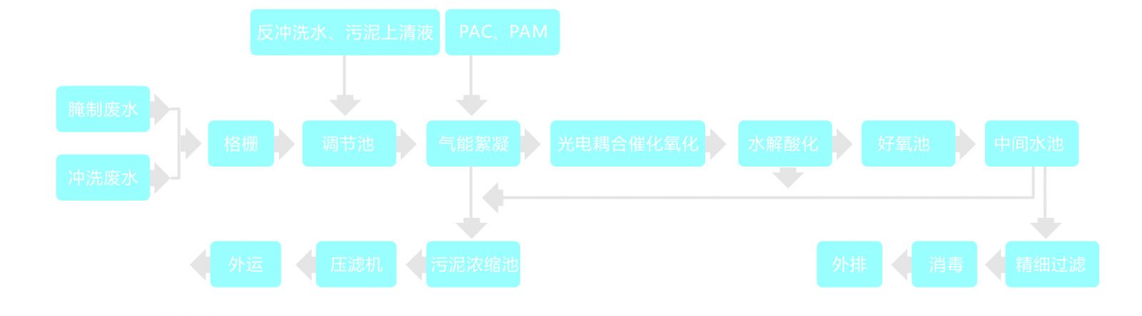 蔬菜腌制及車間沖洗廢水首先進入格柵截留廢水中大的雜物后與各系統反沖洗水、污泥濃縮池的上清液匯合后進入調節池,進行水量和水質調節,并通過厭氧作用去除部分COD后進入氣能絮凝系統,通過投加絮凝劑進一步去除污水中絕大部分懸浮態的無機及有機雜質,出水進入光電耦合催化氧化反應器,通過電解降低廢水中所含的高鹽成分,提高活性極強的羥基自由基的產率,通過加成、取代、電子轉移等反應,將廢水中大部分有機污染物轉化為簡單無機物。出水經過水解酸化后進入好氧池,進一步去除COD、氨氮等各類污染物,再經多級精細過濾、消毒后達標排放。